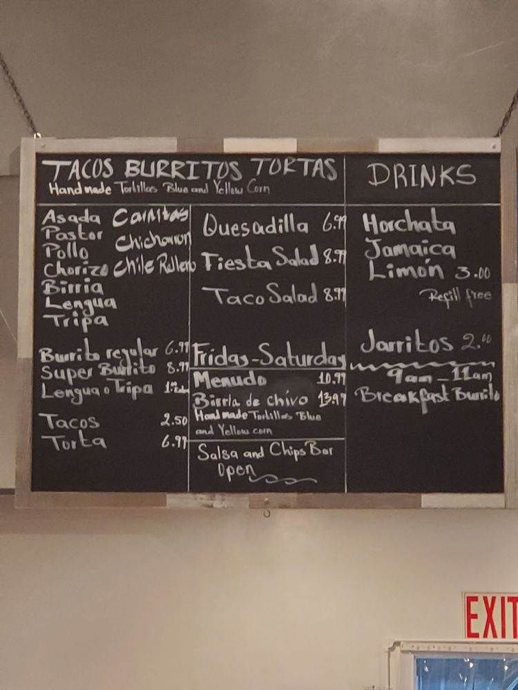 Choice your meat, handmade corn tortillas, onion, cilantro and salsa.